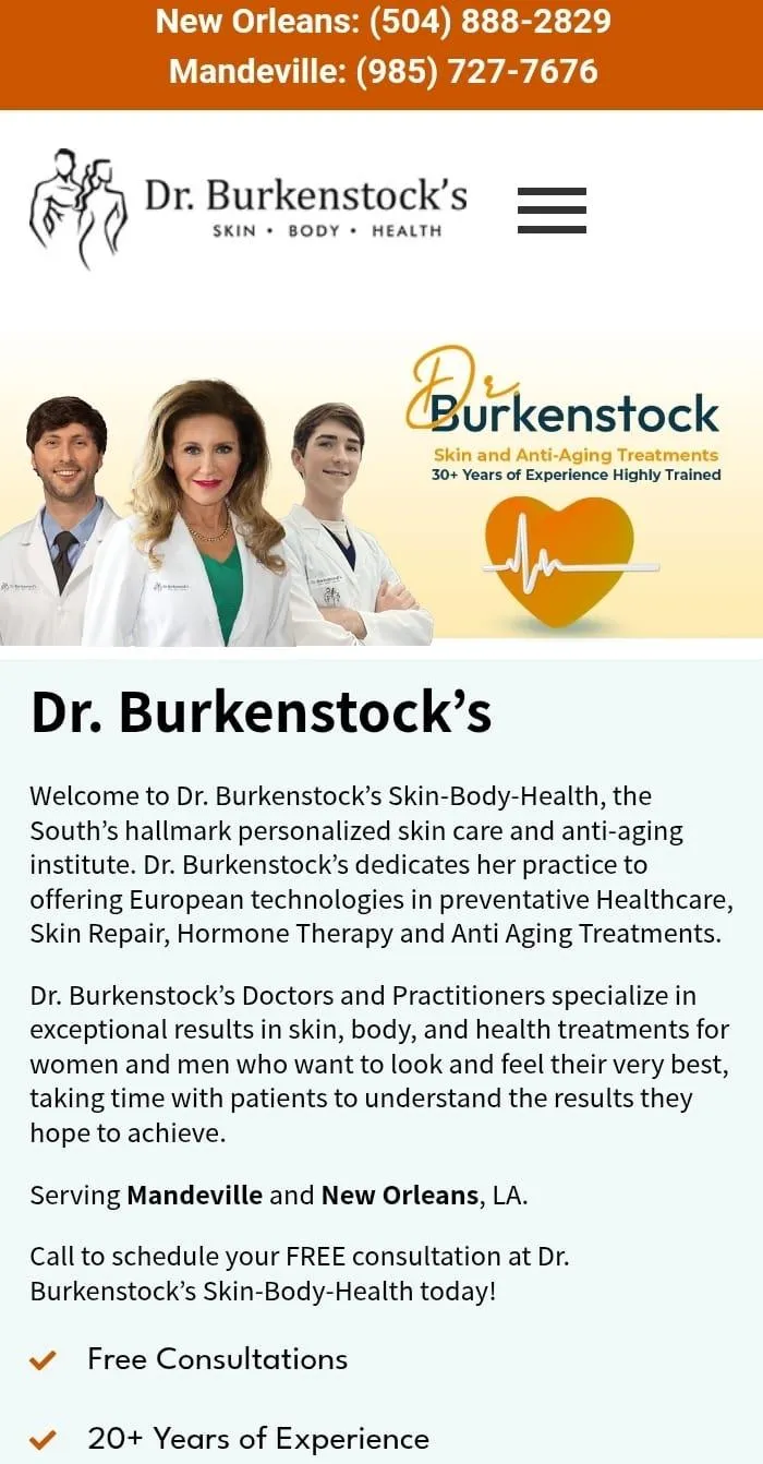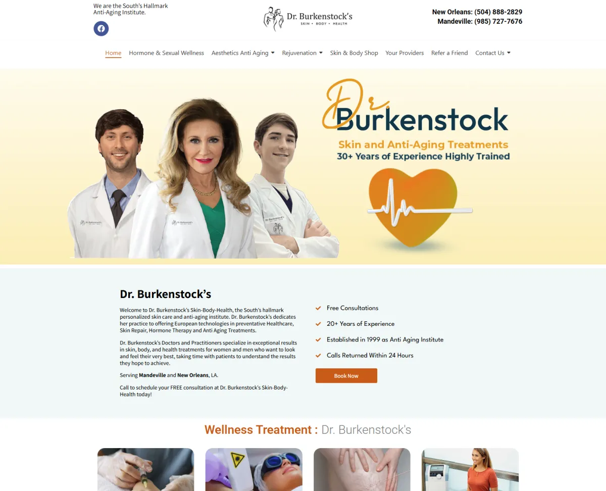 Skin-Body-Health by Dr. Kelly Burkenstock is a fully responsive medical spa website offering luxurious skincare, body care, and anti-aging treatments. Based in Mandeville and New Orleans, LA, the site highlights free consultations, personalized treatment plans, top-tier technologies, and professional care for both women and men